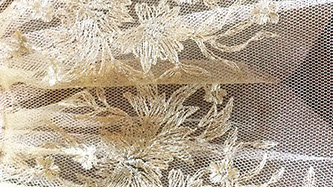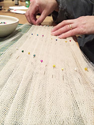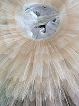 10 layers of netting graduated from tiny leg frills to the largest top layer (in all usually around 10m of netting!). These layers are hand pleated and sewn on to a knicker which we prepare from 2 layers (for greater opacity) of bobbinet mesh fabric.